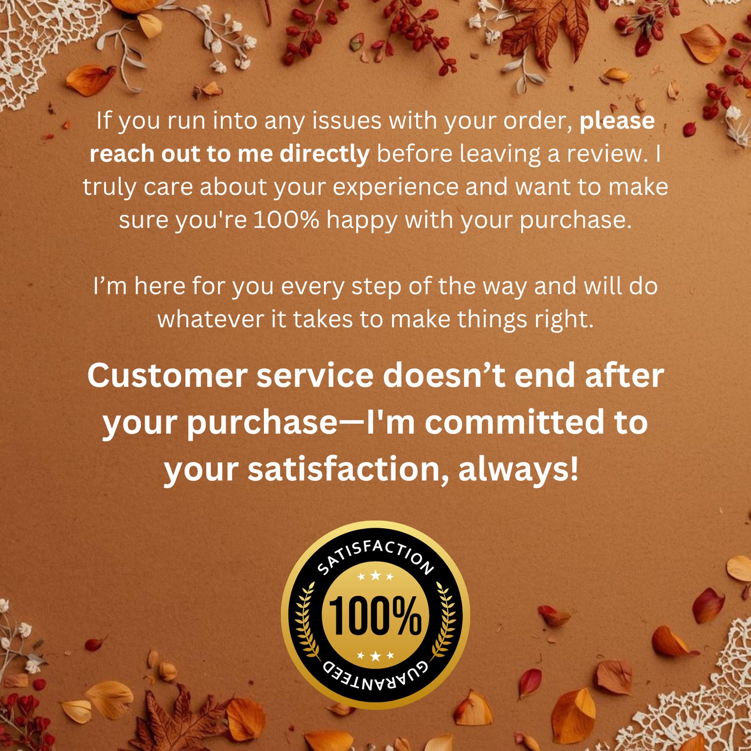 Customer Satisfaction Guaranteed: Need help? Don’t hesitate to reach out directly. I am committed to making sure you are satisfied with your purchase. Message me HERE.