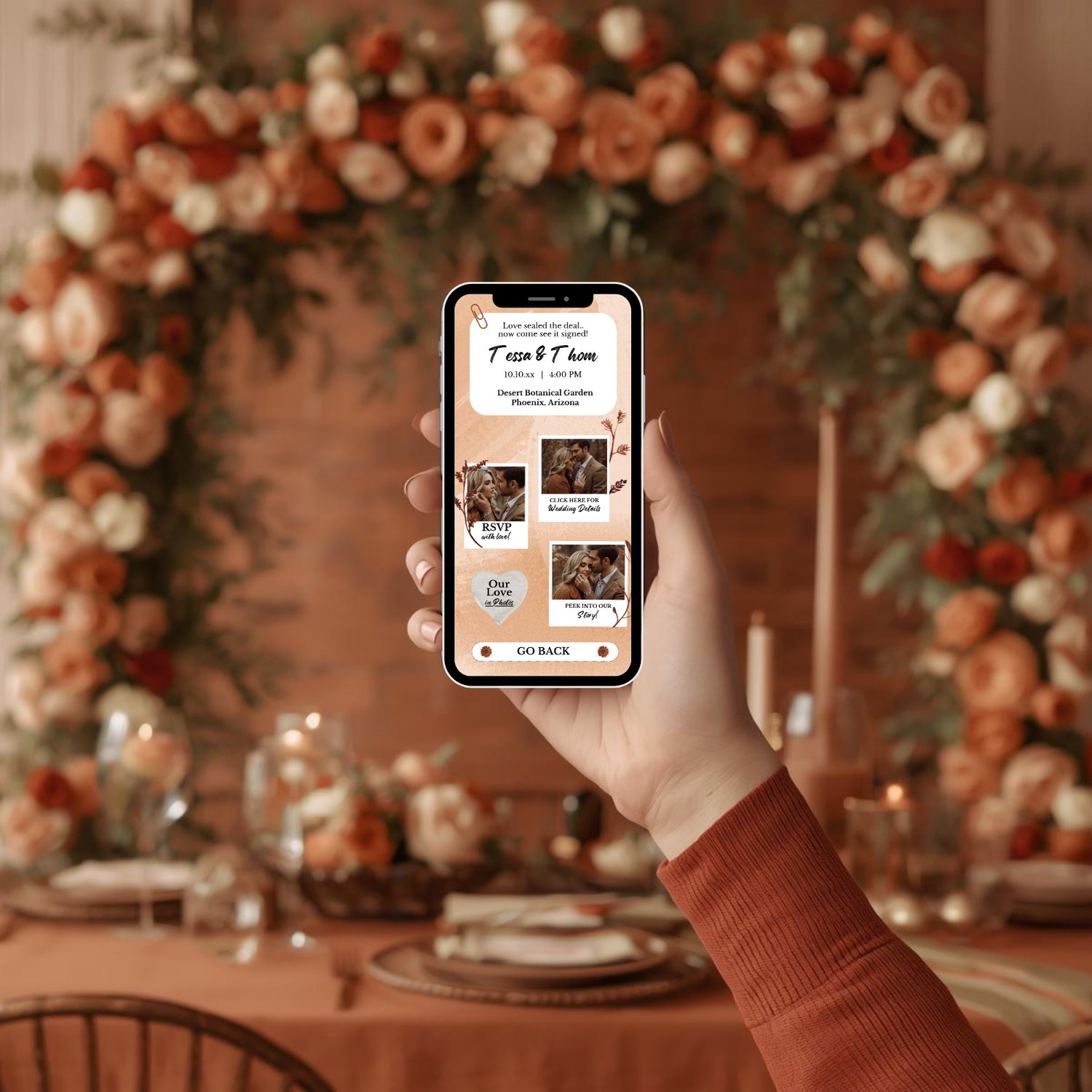 Perfect for any wedding — small or big — it brings the warm tones of burnt sienna, brown, and tan to life beautifully online.