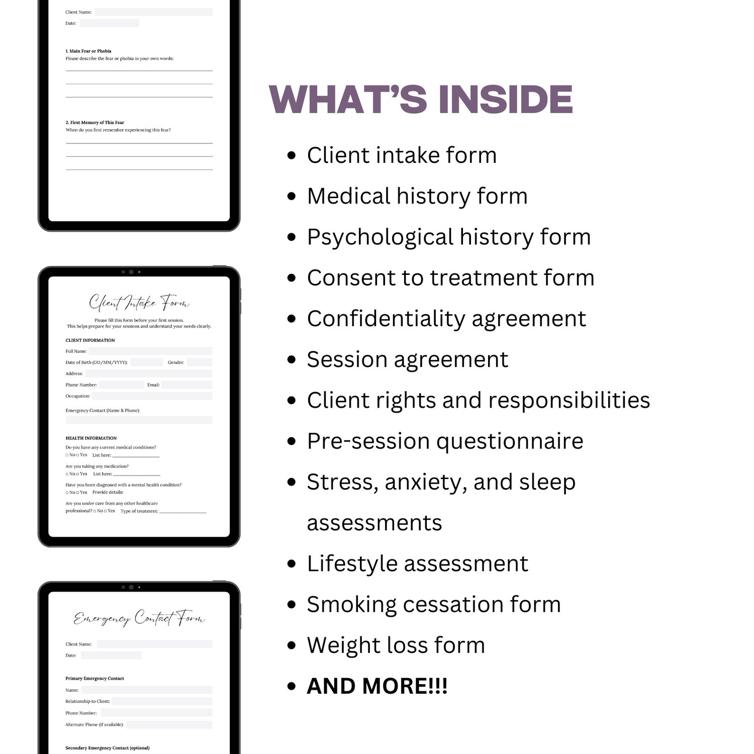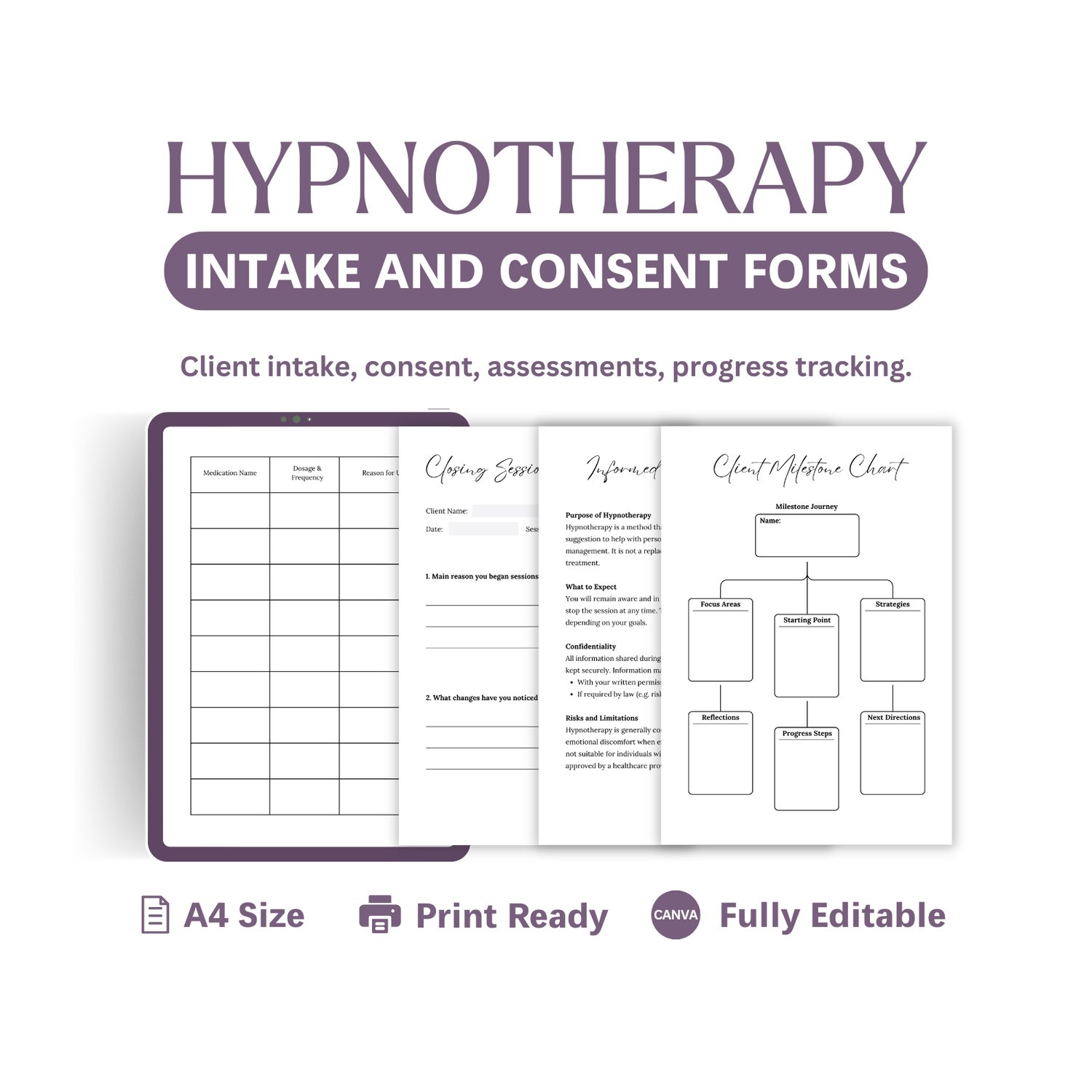 This is a full set of hypnotherapy intake, consent, and client management forms. It helps you collect information, obtain consent, and track client progress all in one place.
