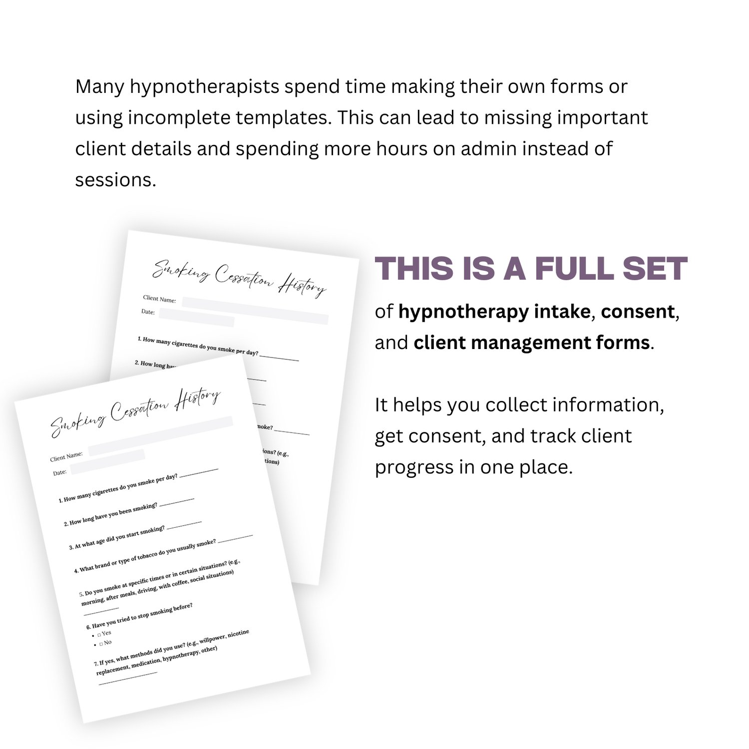Many hypnotherapists spend time creating their own forms or using incomplete templates. This can lead to missing important client details and spending more hours on administration instead of focusing on sessions.