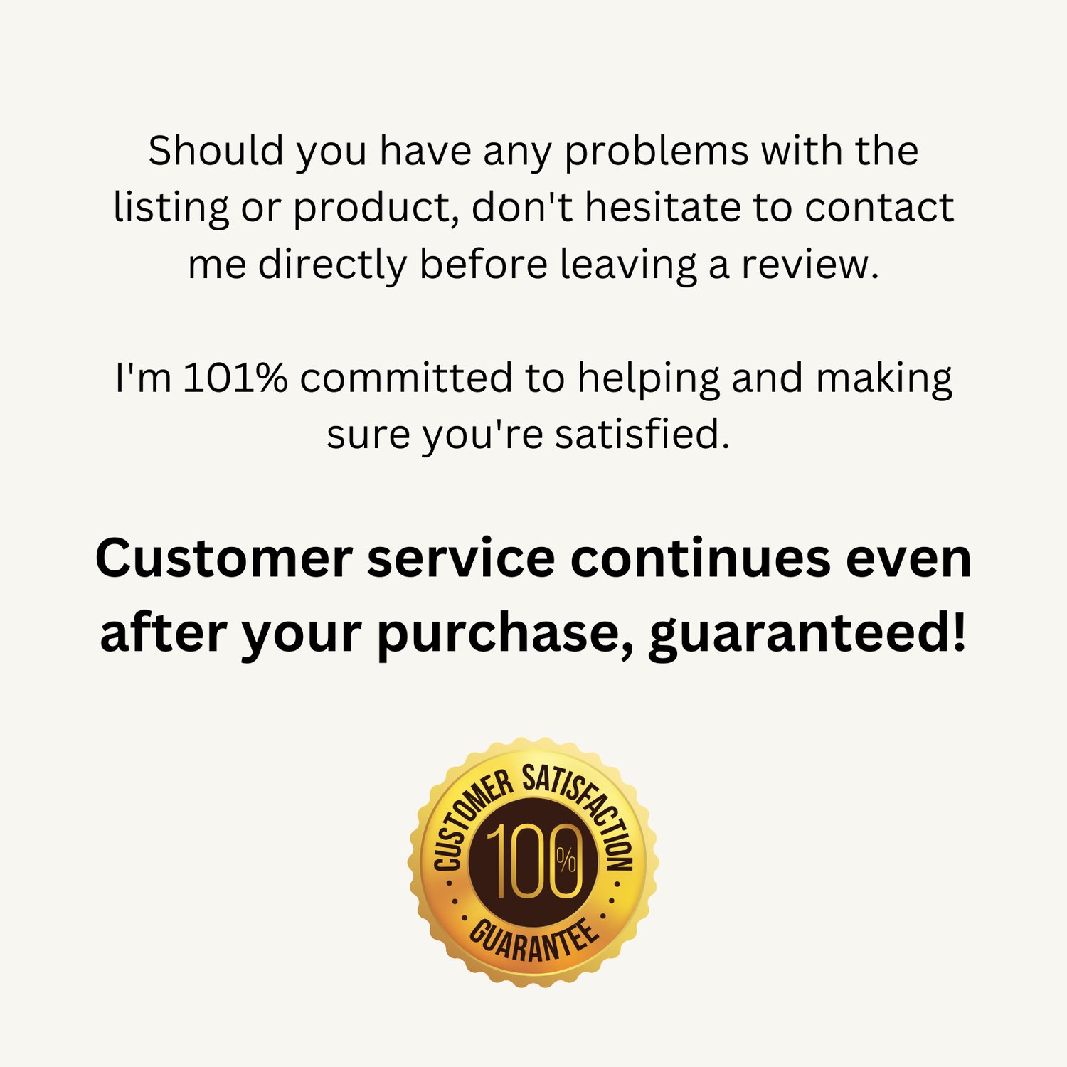 I'm 101% committed to helping and making sure you're satisfied. Customer service continues even after your purchase, guaranteed! ๐