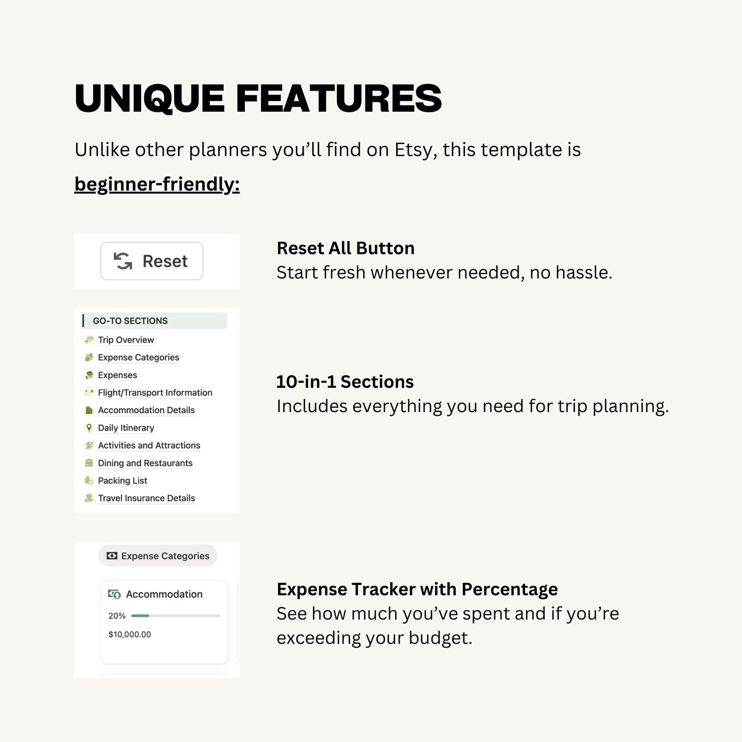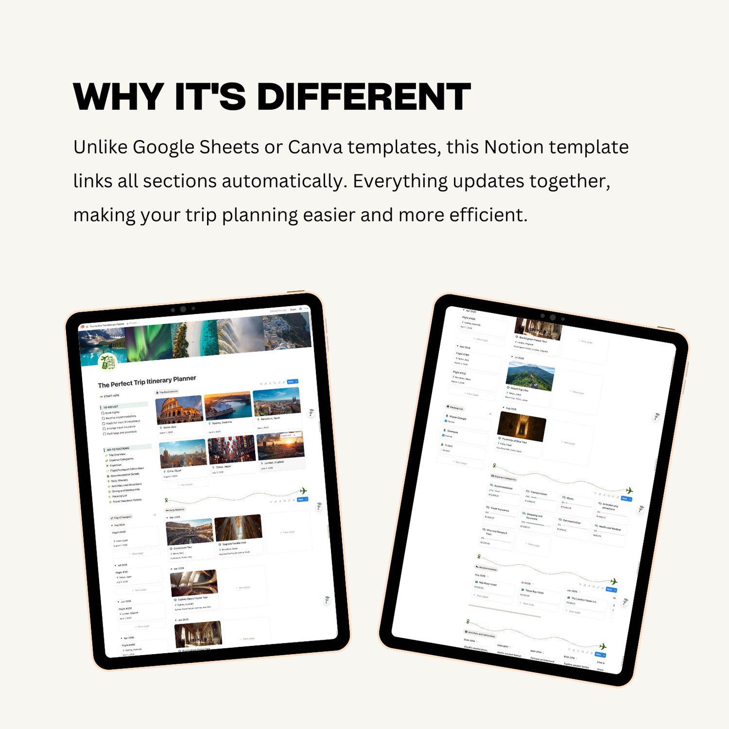 Unlike Google Sheets or Canva templates, this Notion template links all sections automatically. Everything updates together, making your trip planning easier and more efficient.