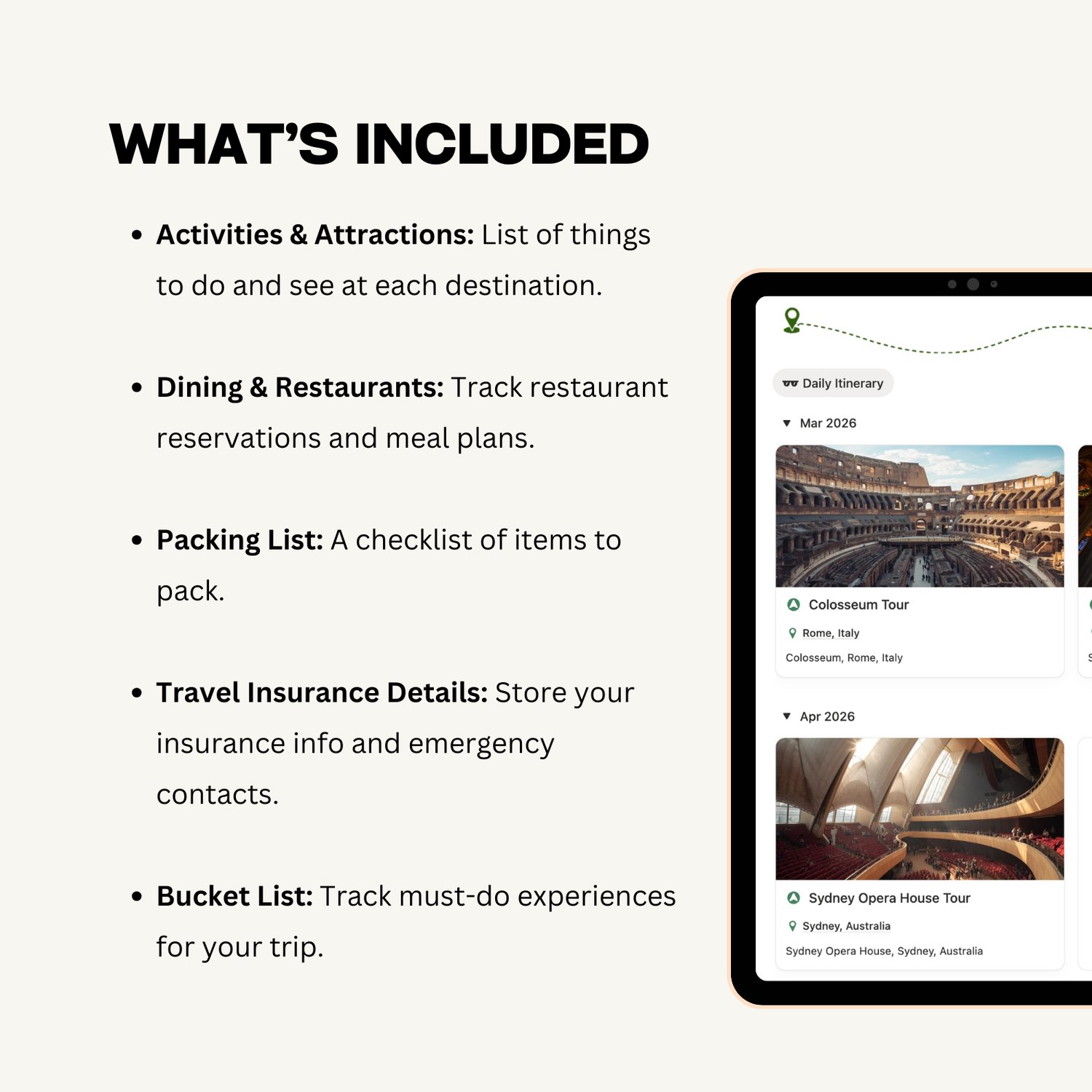 - Travel Insurance Details: Store your insurance info and emergency contacts.