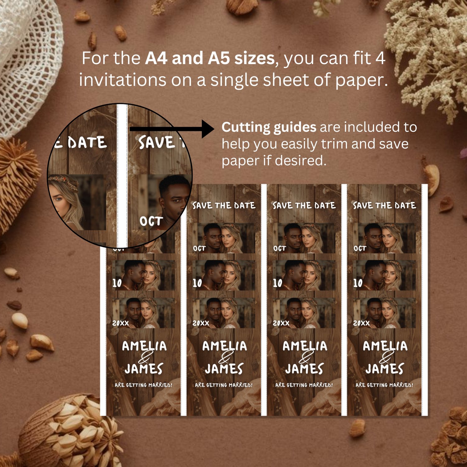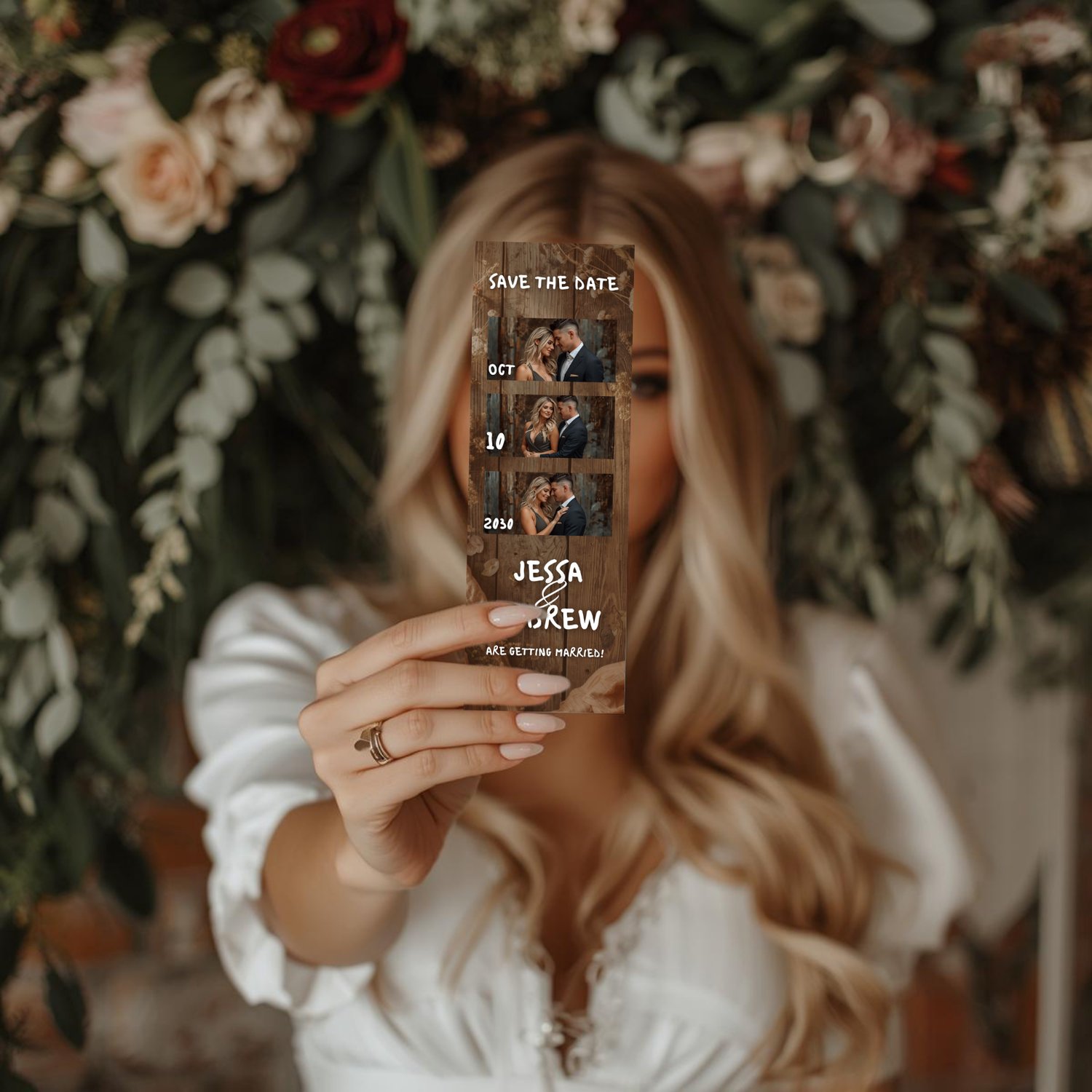 Photo Strips Save the Date: Rustic Bohemian Wedding Invitation (Editable Canva Template, RSVP QR Code)