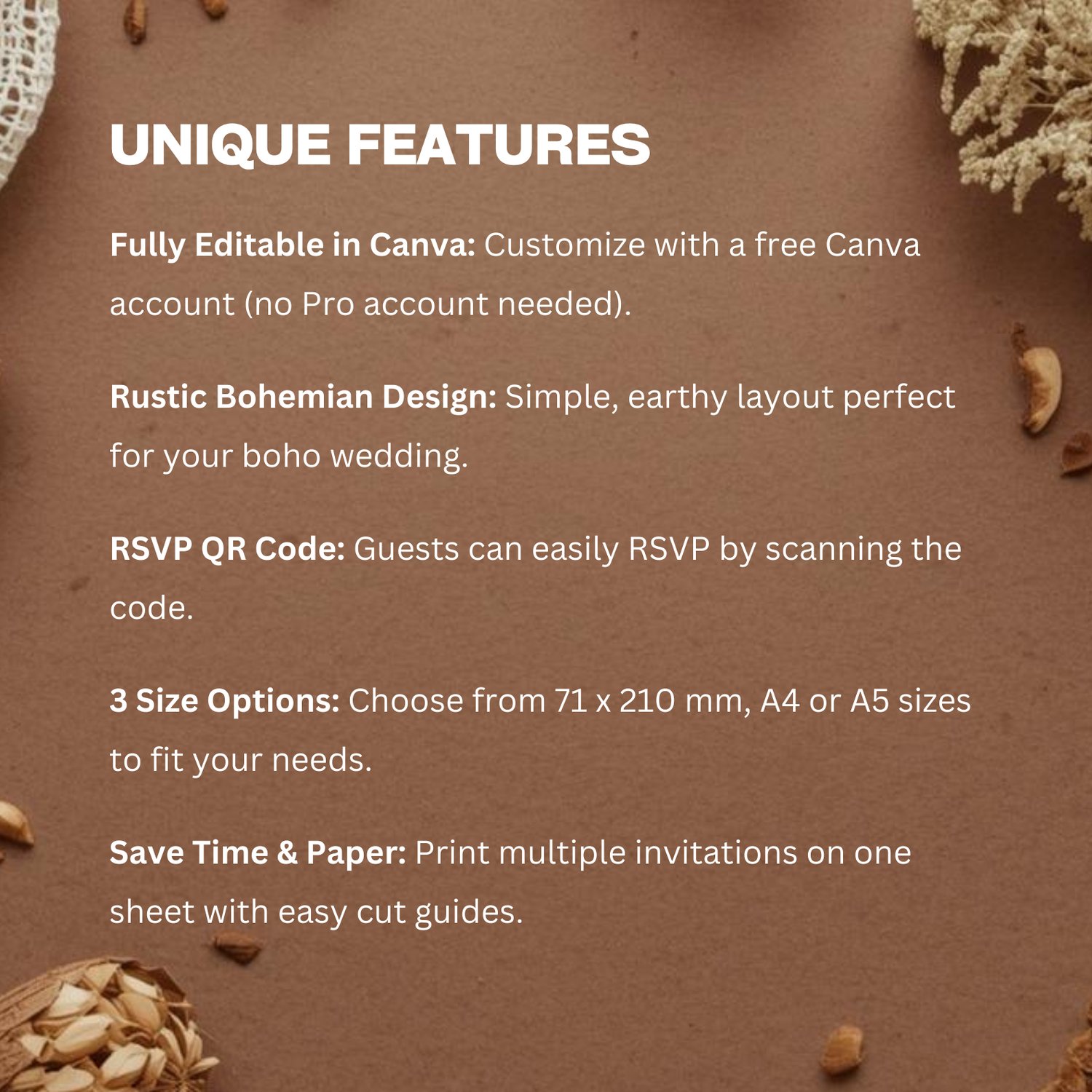 Rustic Bohemian Photo Strips Wedding Save the Date Invitation Template with Details, RSVP QR Code (Google Form Template Included - Fully Editable) | Fully Editable Canva Template | 3 Sizes